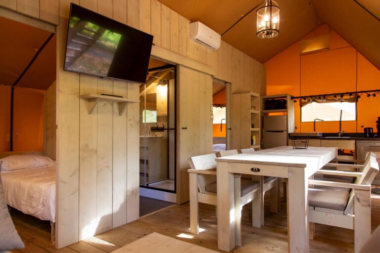 Een gezellige glamping tent voorzien van alle comfort. Er zijn verschillende types beschikbaar, maar ze hebben allemaal dezelfde indeling: